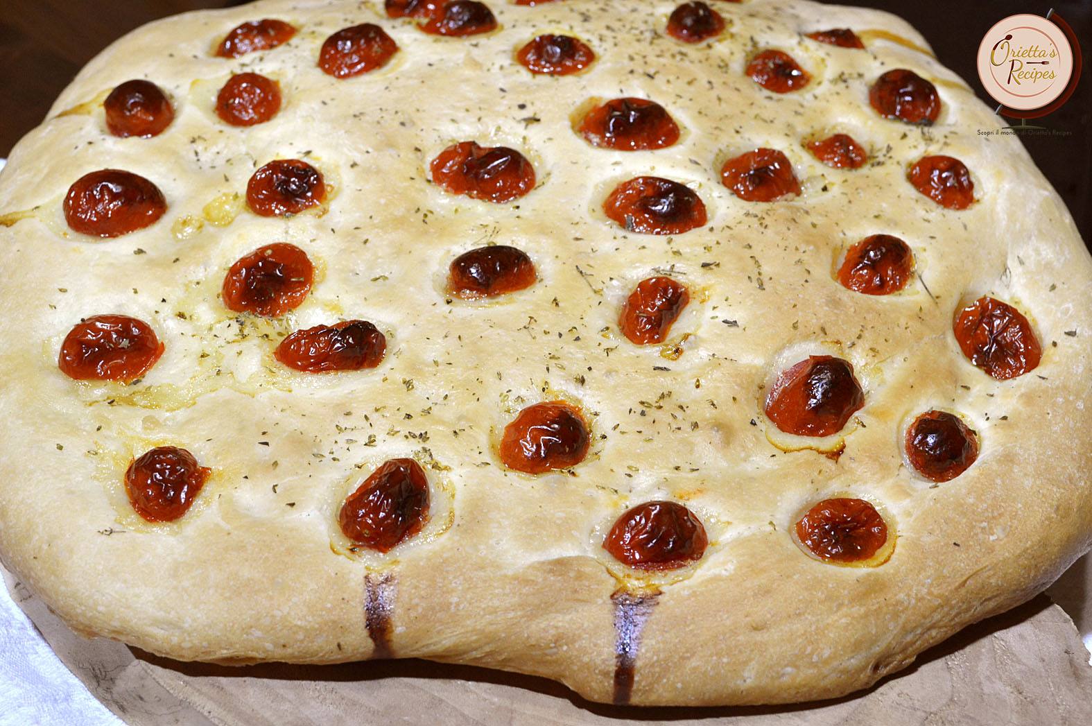 - Quando la vostra focaccia risulterà ormai lievitata guarnite con i pomodorini precedentemente lavati e divisi a metà e l'origano (fig.8);